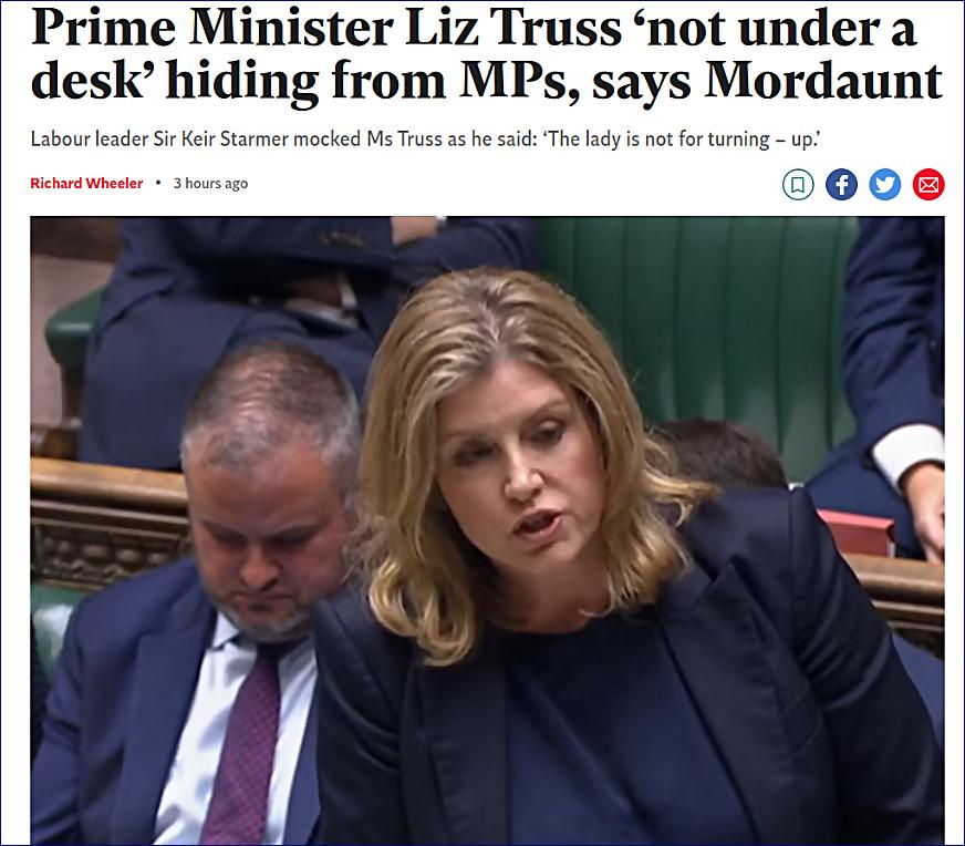Trussová se v pondělí navzdory výzvám labouristů odmítla dostavit do parlamentu, což vedlo Penny Mordauntovou, která ji zastoupila, k ujištění, že se "paní premiérka neschovává pod stolem".
