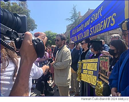 Protestní studentský tábor na podporu Palestinců v Gaze a proti vyzbrojování Izraele americkými univerzitami byl brutálně napaden proizraelskými aktivisty. Fyzický útok trval několik hodin, policie obětem útoků nepomohla. Nyní se na UCLA, University of California v Los Angeles, konají shromáždění studentů i profesorů, důrazně podporující táboříci propalestinské studenty.