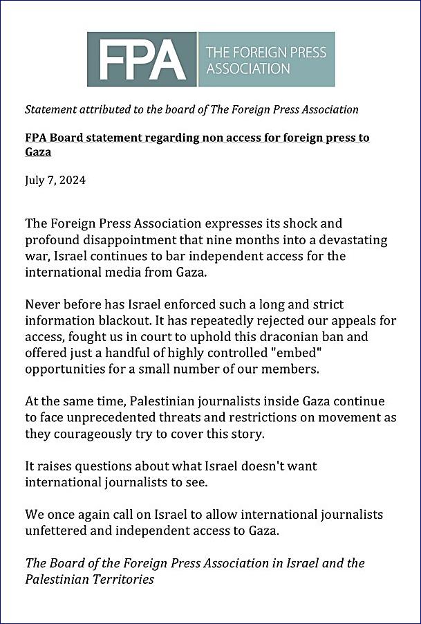 Nikdy předtím Izrael neprosazoval tak dlouhý a přísný informační blackout. Opakovaně odmítl naše žádosti o přístup, bojoval proti nám u soudu, aby tento drakonický zákaz potvrdil, a nabídl jen několik vysoce kontrolovaných "embed" příležitostí pro malý počet našich členů.