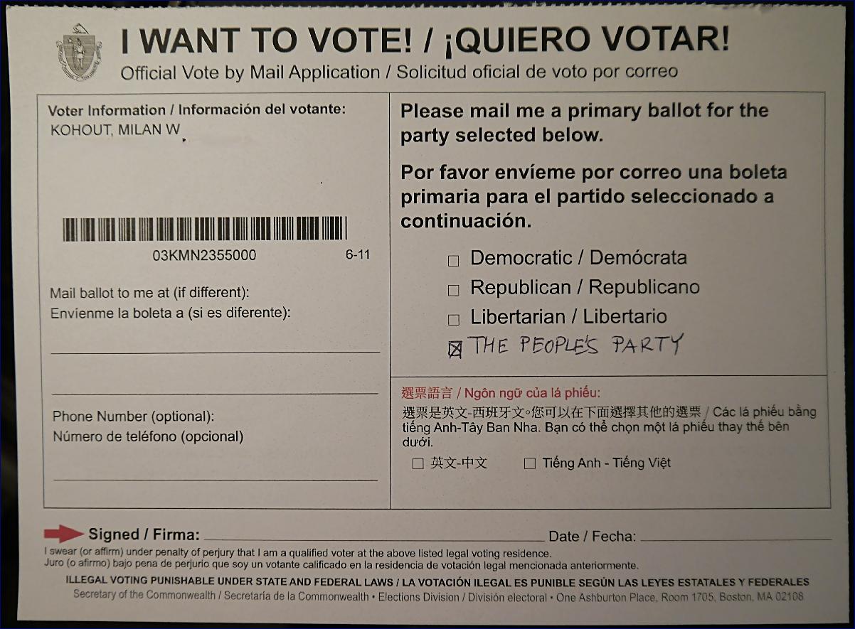 Toto je žádost o korespondenční volbu v primárních volbách v Massachusetts.