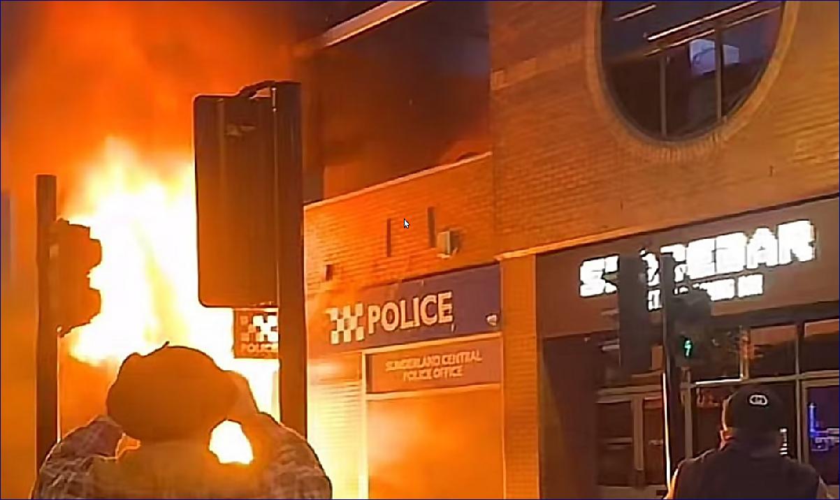 V pátek byla v Sunderlandu zapálena policejní stanice, když se policisté snažili zadržet několik stovek násilníků během další noci plné nepokojů.