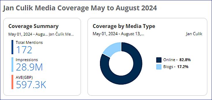 Děkuji vám, Jane, že jste mi dal vědět. Provedla jsem rychlé vyhledání mediálních vystoupení, abych vyčíslila váš dosah v médiích. Na základě toho, co jste uvedl o svých četných mediálních výstupech, jsem provedla vyhledávání od 1. května do 13. srpna 2024 prostřednictvím naší online služby mediálního vlivu. Vyšly z toho tyto informace ohledně mediálních článků na internetu: