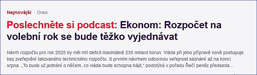 Pozn. JČ: No, to je těžké, jako by člověk hrách na stěnu házel. Česko je pašalíkem oligarchů a Fialova vláda daněmi zatěžuje chudé lidi, nezdaňuje, jak se to děje ve všech civilizovaných zemích, oligarchy. Ovšem Čechům to nevadí, že jim byla jejich země ukradena. Nechávají na sobě dříví štípat. Podobně v Praze, která se dusí znečištěním vzduchu z automobilů, což způsobuje infarkty i mladým lidem, ale koho by to zajímalo, Pražáci volí ODS... Podcasty (moc) nepomůžou. Češi na realitu reagují ideologicky, fakta pragmaticky nevnímají...