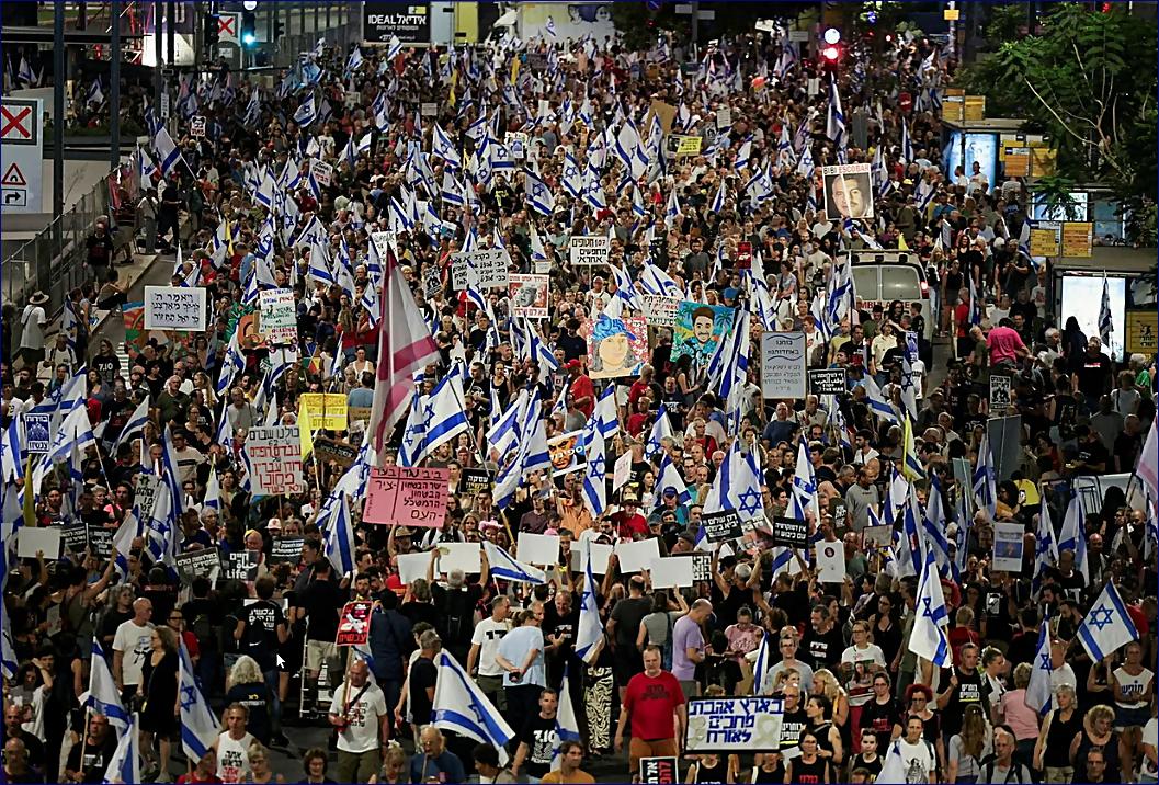 Tisíce Izraelců protestují v sobotu večer proti vládnoucí koalici a požadují dohodu o propuštění rukojmích držených Hamásem v Gaze a předčasné volby, píše izraelský deník Haaretz.