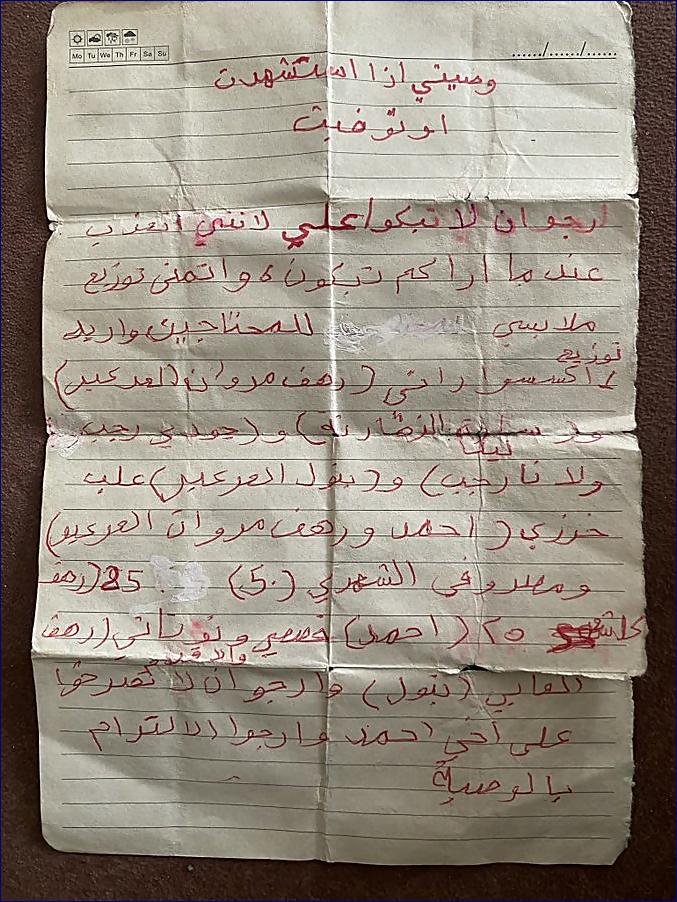 Závěť nalezená pod sutinami Raši, teprve desetiletého dítěte, které zabila izraelská armáda v #Gaze: „Prosím, neplačte pro mě, protože bych byl smutný. Doufám, že mé oblečení dostanou ti, kteří to potřebují, a mé doplňky Rahaf, Lana a Batool. Krabičky s korálky by měly jít k Batool. Co se týče mého měsíčního kapesného 50 šekelů, chci, aby polovinu dostal Rahaf a druhou polovinu Ahmad. Chtěl bych, aby mé hračky dostal Batol. A nakonec, prosím, nekřičte na mého bratra Ahmada. Prosím, dodržujte tato přání.“