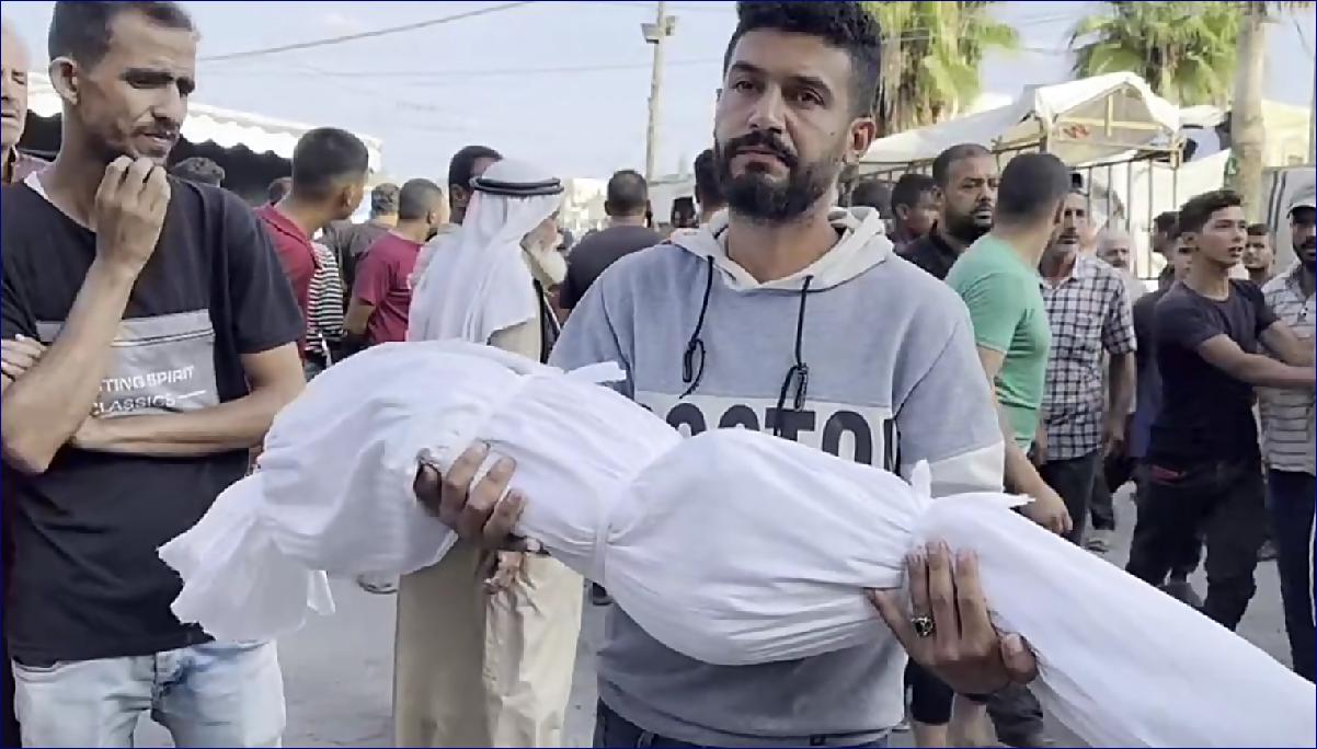 Alex Thompson: Dnes brzy ráno přišel první úder. Cílem útoku, který izraelská armáda označuje za "přesný útok na Hamás", se stala mešita a škola, v níž jsou ubytováni vysídlenci. Bezprostřední následky, natočené pro Channel 4 News. Modlitba uprostřed krveprolití nad jedním z nejméně 26 zde zabitých lidí. V Deir al Bala v centrální části Gazy, humanitární, cituji „bezpečné zóně“ pouze podle názvu. Mezi mrtvými, které dnes ráno vynesli před nemocnici, je i toto dítě, otec prostě nemá slov. Jemně zahalený další nevinný zničený život. A pak se zármutek nedaleko od něj mění v hněv.