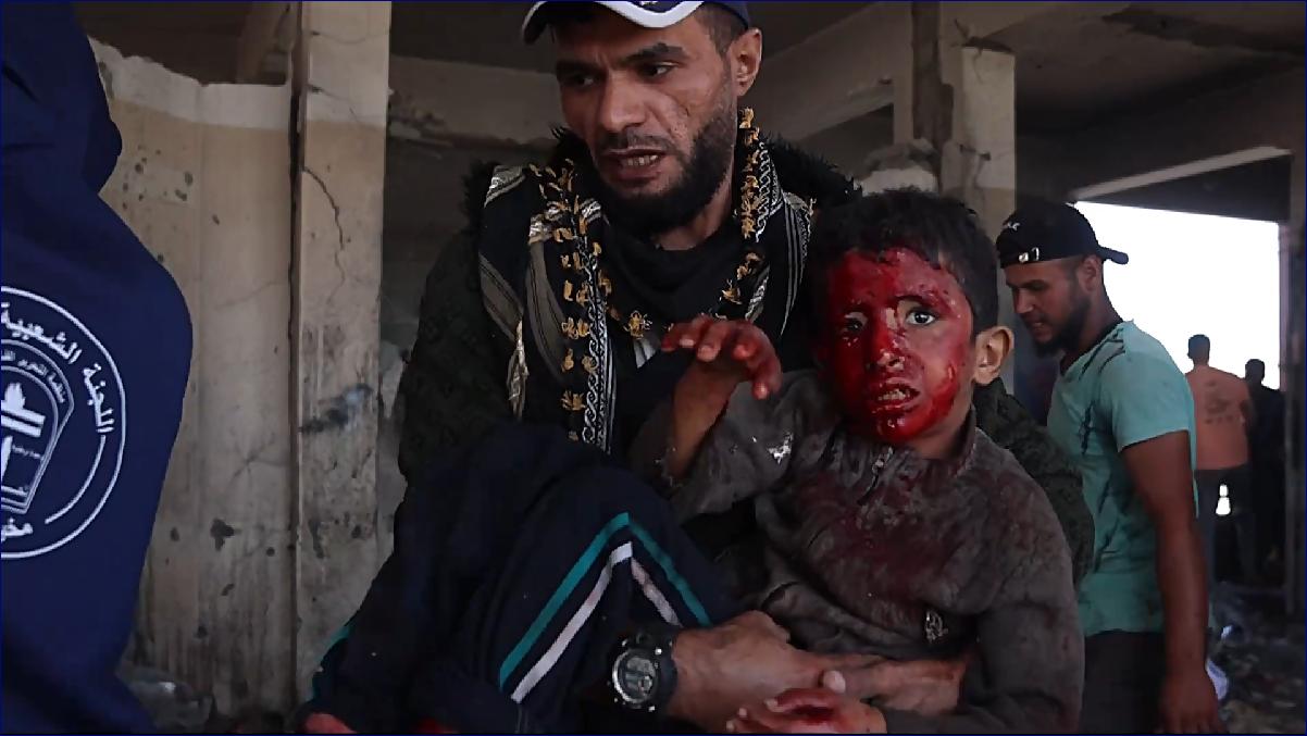 Reportér: Můj bratr Ferras křičí. Bolest je zdrcující, u nohou mu leží mrtvoly. To jsou okamžiky těsně po izraelském úderu na školu, kde se ukrývají tisíce vysídlených Palestinců. Kameraman, který s námi spolupracuje, byl jen pár minut od zásahu izraelskou raketou. Zoufalé rodiny zoufale hledaly své příbuzné.