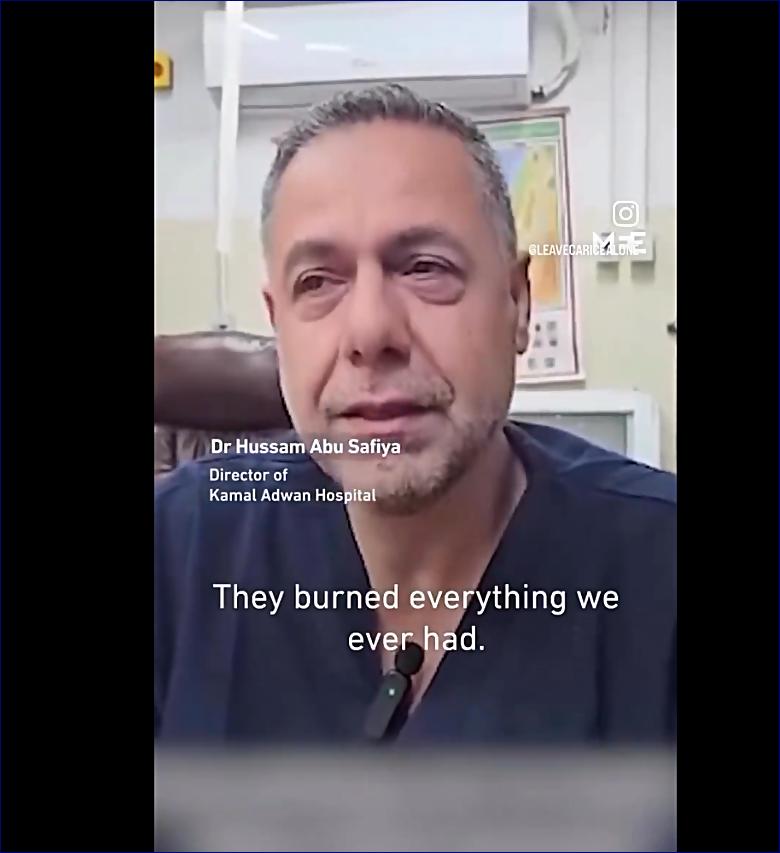 "V této nemocnici jsme přišli o všechno. Dokonce i o své děti. Spálili všechno, co jsme měli. Spálili naše srdce. A zabili mého syna. Byli jsme zničeni ohledně nemocnice, úplně ji vypálili. Zabili mého syna. Protože jsme šířili humanitární poselství, tak byly naše děti zabity. A já jsem pohřbil svého syna na nemocničním dvoře. Za tohle všechno přišla odměna, že byly naše děti zabity před našima očima a my jsme je pohřbili vlastníma rukama."