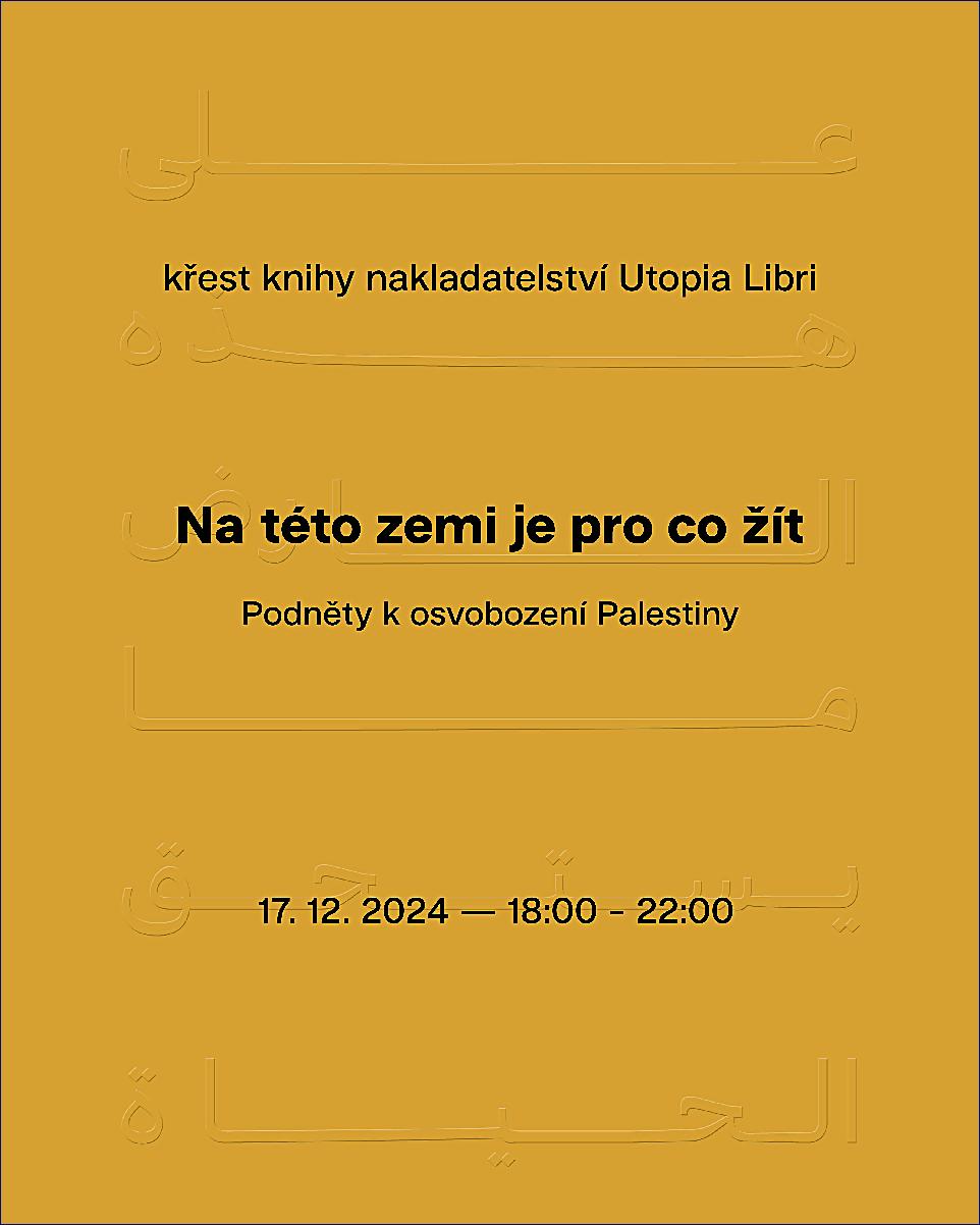 dovolujeme si Vás srdečně pozvat na křest knihy „Na této zemi je pro co žít“, sborníku textů o Palestině, který se uskuteční 17. 12. od 18:00 v Acid Coffee (Dukelských Hrdinů 25, Praha 7). Pozvánku naleznete v příloze tohoto emailu.