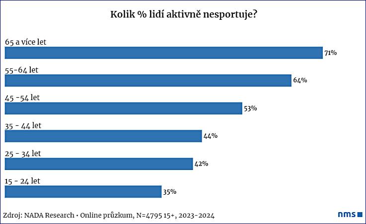 Obvykle platí, že s věkem ubývá lidí, kteří sportují, o to více alarmující je, že už ve věkové skupině 15–24 let se žádné sportovní aktivitě nevěnuje více než třetina dotázaných.