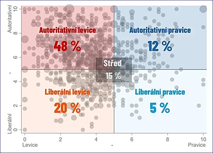 "Největší segment tvoří autoritativní levice (48 %). Jsou to lidé, kteří preferují silný stát a uzavřenější společnost. Typickým reprezentantem segmentu je ANO (a s odstupem Stačilo! a SPD). "