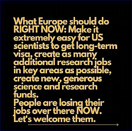 Učinit to nesmérně lehké pro americké vědce, aby dostali dlouhodobá vstupní víza, vytvořit co největší množství dalších výzkumných míst v klíčových oblastech, vytvořit nové, velkomyslné vědecké a výzkumné fondy. Lidé v USA TEĎ přicházejí o svá místa. Přivítejme je HNED TEĎ!