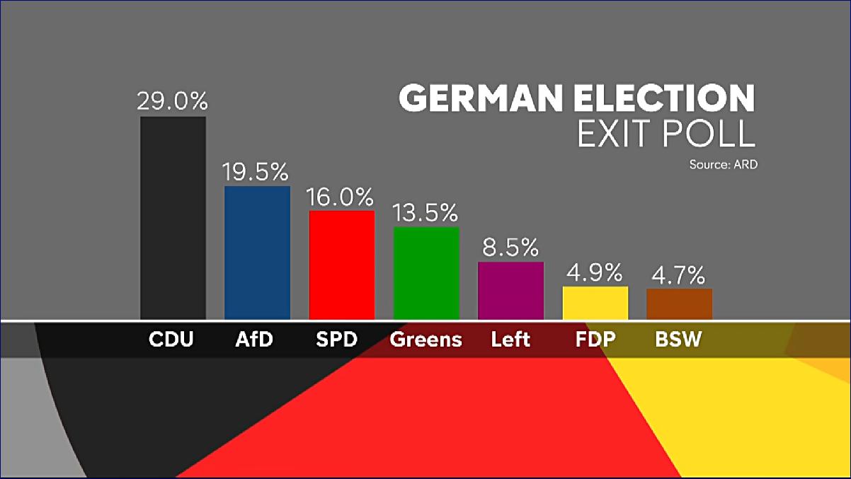 Hlasování skončilo a průzkumy předpovídají, že příští vládní stranou v koalici se stanou křesťanští demokraté Friedricha Merze. A on příštím německým kancléřem. A samozřejmě organizátor této koaliční vlády, poté, co jeho strana posbírala 29 % hlasů. Ale na druhém místě s 19,5% podílem je krajně pravicová AfD, Alternative für Deutschland. A zdá se, že v novém složení německého Bundestagu budou významnou silou. Středolevicová SPD v čele se současným kancléřem Olafem Scholtzem získala 16 %, ale podoba případné koalice závisí na tom, zda menší strany získají mandáty. K tomu, aby byly zastoupeny, potřebují 5 %, a to je na ostří nože. Pokud se jim to podaří, mohlo by to CDU značně ztížit pohodlné spojenectví se sociálními demokraty a Zelenými, historicky přirozenými partnery ve vládě.