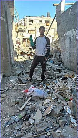 Trpíme tu mnoha věcmi Můj dům byl úplně zničen a já stále žiji ve stanu z látky Pracuji na odstranění trosek svého domu v Rafáhu A stavím stan, malou kuchyň a koupelnu Takže potřebuji dary a pomoc