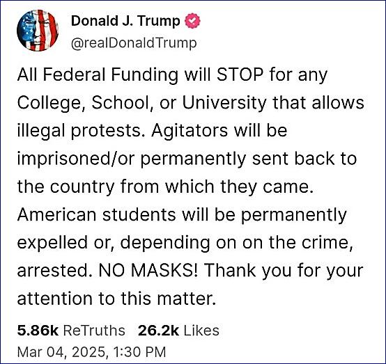 Trump: Veškeré federální financování bude ZASTAVENO pro všechny školy a univerzity, které povolí ilegální protesty. Agitátoři budou uvězněni anebo natrvalo deportováni do zemí, odkud přišli. Američtí studenti budou natrvalo vyloučeni ze studia anebo, podle jejich zločinů, zatčeni. ŽÁDNÉ ROUŠKY! Děkuji vám za pozornost k této věci