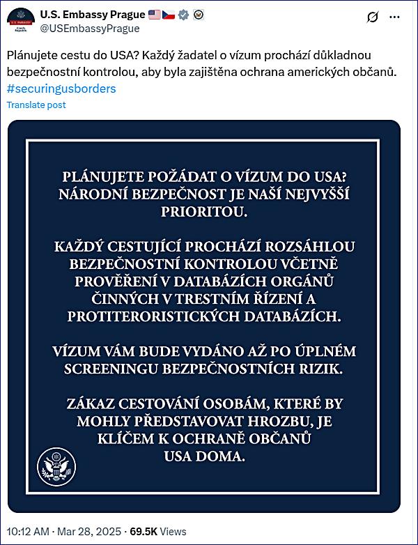 Nejhorší jsou nyní samozřejmě Spojené státy, kde Trump likviduje univerzity a zatýká studenty a profesory za názory. Mimochodem, i americké velvyslanectví v Praze šokujícím způsobem varovalo české občany, že pokud budou cestovat do USA, budou zkoumány jejich názory, vyjádřené na sociálních sítích, viz obrázek výše. Prostě tam nejezděte. (Počet Kanaďanů, kteří letěli do USA v březnu 2025, poklesl ve srovnání s březnem 2024 o 70 procent. Kanaďané teď jezdí na dovolenou do Evropy.)