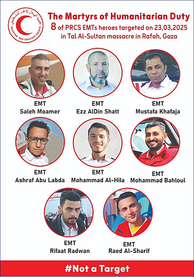 Před svítáním se Saleh vrátil na místo činu a v oblasti písečných dun v Tel al-Sultanu známé jako Hašašín už viděl jen prázdnou sanitku, řekl Bilal. Odjel zpět na stanici záchranné služby v al-Mawasi, několik kilometrů po pobřeží, a zorganizoval záchranný konvoj sanitek Červeného půlměsíce, jasně červeného hasičského vozu civilní obrany a vozidla OSN. Celkem 13 zdravotníků a záchranářů odjelo do Hašašínu hledat své pohřešované kolegy a bylo to naposledy, kdy je viděli živé.
