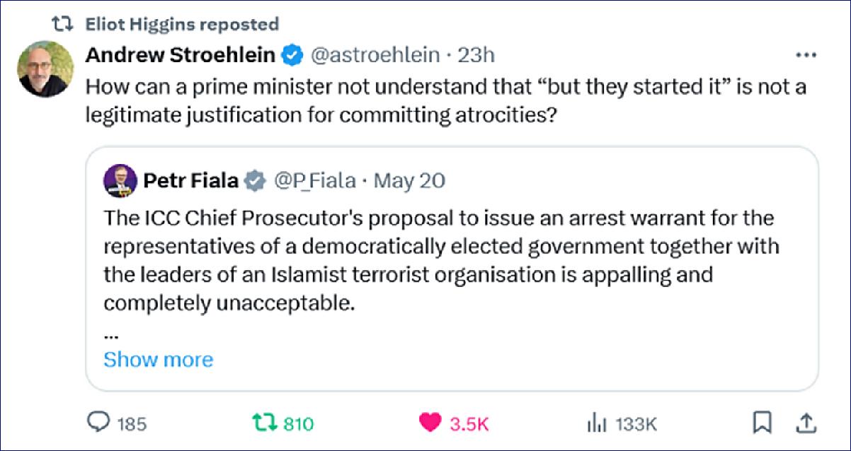 Obrázek: Jak může pan premiér nechápat, že "ale oni si začali" není legitimní ospravedlnění pro páchání zvěrstev? Andrew Stroehlein, Human Rights Watch