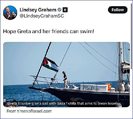 Dvanáct aktivistů za lidská práva z mezinárodní organizace Freedom Flotilla Coalition (FFC) právě pluje na malé lodi Madleen do Gazy. Doufají, že vytvoří humanitární námořní koridor přes nelegální blokádu Izraele. Pokud vše půjde dobře, měli by dorazit tento víkend s „dětskou výživou, moukou, rýží, plenkami, dámskými hygienickými potřebami, soupravami na odsolování vody, zdravotnickým materiálem, berlemi a dětskými protézami“¨, píše na webu Common Dreams Margaret Knapke.