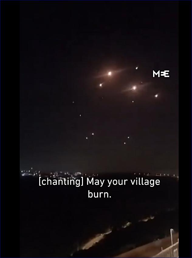 Izraelská rodina jásala, když íránské rakety dopadly na palestinské město v severním Izraeli a způsobily 18 obětí. Když rakety dopadaly, skandovali „Ať vaše vesnice shoří“, což je populární nacionalistický slogan a název písně izraelského zpěváka Kobiho Peretze, která vyzývá k vypálení Gazy.