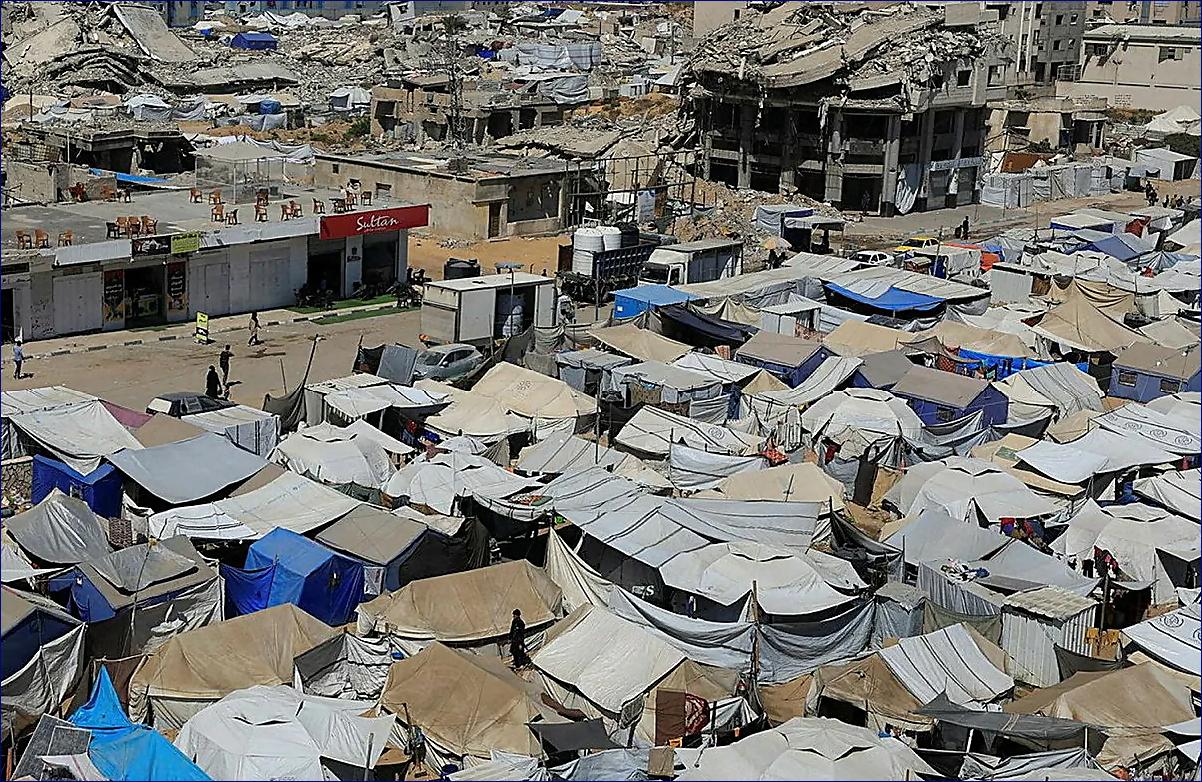 Přeplněnost je viditelná i z vesmíru. Stanové tábory, jako v Khan Yunis, Gaze a dalších místech, byly zničeny a evakuovány. Stany se objevily na každém volném místě v zbývajících oblastech mimo červenou zónu, hlavně v Muwasi v jižní Gaze a v západní části města Gaza. Stany tam byly postaveny podél pláže, na moloch zasahujících do moře, mezi ruinami, na chodnících a silnicích a na skládkách odpadků. Tisíce dalších vysídlených lidí se tísní ve školách a veřejných budovách za stále se zhoršujících podmínek.
