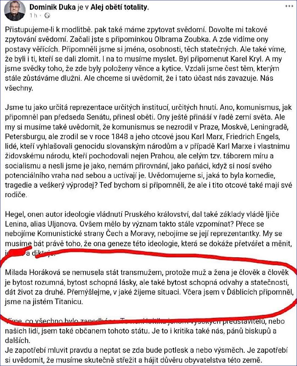 Dominik Duka opět unáší Ježíšovo učení a využívá církev k šíření ďábelských slov. Duka se ve svém příspěvku na Facebooku, který reprodukuje jeho projev na akci proti obětem komunistického režimu, obnažil (a