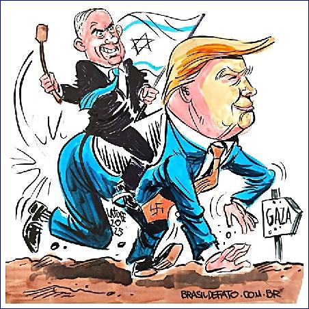 Trump to nazývá „honem na čarodějnice“ a tvrdí, že „Bibi a já jsme právě prošli peklem, bojovali jsme proti velmi tvrdému a brilantnímu dlouholetému nepříteli Izraele, Íránu, a Bibi nemohl být lepší, bystřejší ani silnější ve své lásce k neuvěřitelné Svaté zemi“. Oba muži mají špatný zvyk zasahovat do volebních a nyní i soudních záležitostí druhé země, a to navzájem. Bibi pronesl rouhavý projev před Kongresem na pozvání Trumpových přisluhovačů a vzájemně se podporovali ve svých volbách. Nyní jsou globálními spolukandidáty a berou nás s sebou do pekla.