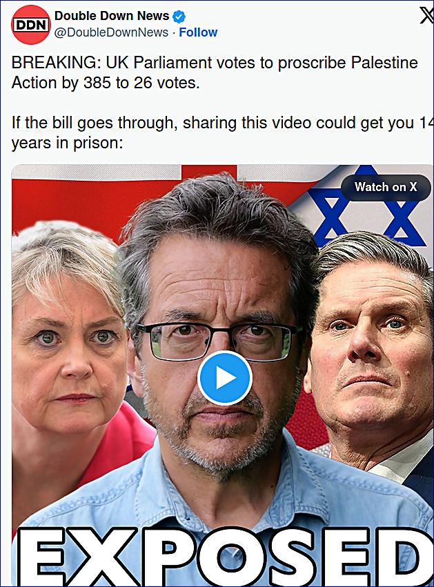 BREAKING: UK Parliament votes to proscribe Palestine Action by 385 to 26 votes.