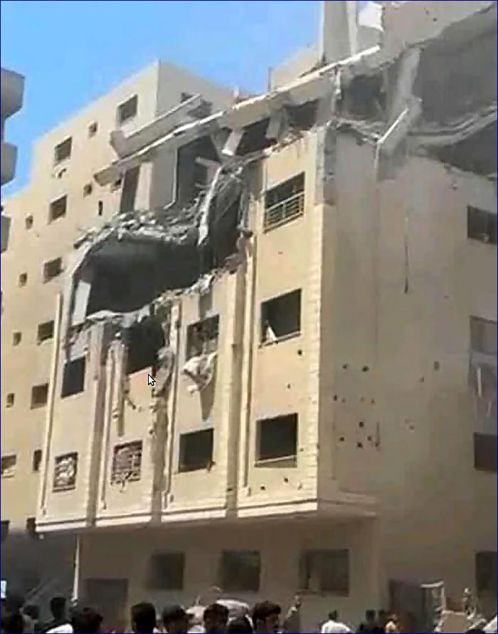 Fotografie a videa pořízená místními novináři ukazují, že bytový dům byl zasažen v přední části čtvrtého a pátého patra, zatímco zbytek zůstal nepoškozen.
