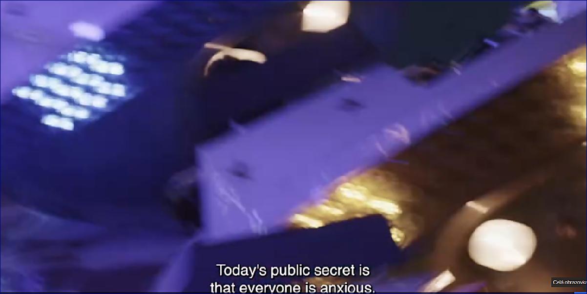 Velmi brzo poté obraz degeneruje ve směsi nejasných, rychle se pohybujících rozostřených polotvarů, což trvá dlouhé minuty a znázorňuje to psychický stav postižené hlavní postavy. Celým filmem pak pokračují dlouhé sekvence rozostřených, nejasných a rychle se míhajících obrazů s monologem o psychickém vyhoření.