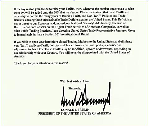 Současného brazilského prezidenta Luize Inácia Lulu da Silvu tím dostalo toto oznámení do nepříjemné situace. Přestože jejich vzájemný vztah byl chladný, ale věcný, nová cla představují přímou ekonomickou odvetu kvůli čistě domácí právní kauze. Hrozba šetření podle článku 301 amerického obchodního zákona – běžně používaného proti nečestným obchodním praktikám – pak situaci jen vyostřila.