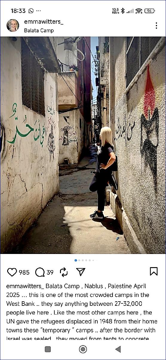 IDF právě zabila Emmu Wittersovou. Skotskou ženu, která dokumentovala život na Západním břehu. Měla účet na YouTube a TikToku, kde ukazovala, jak lidé žijí v táborech.