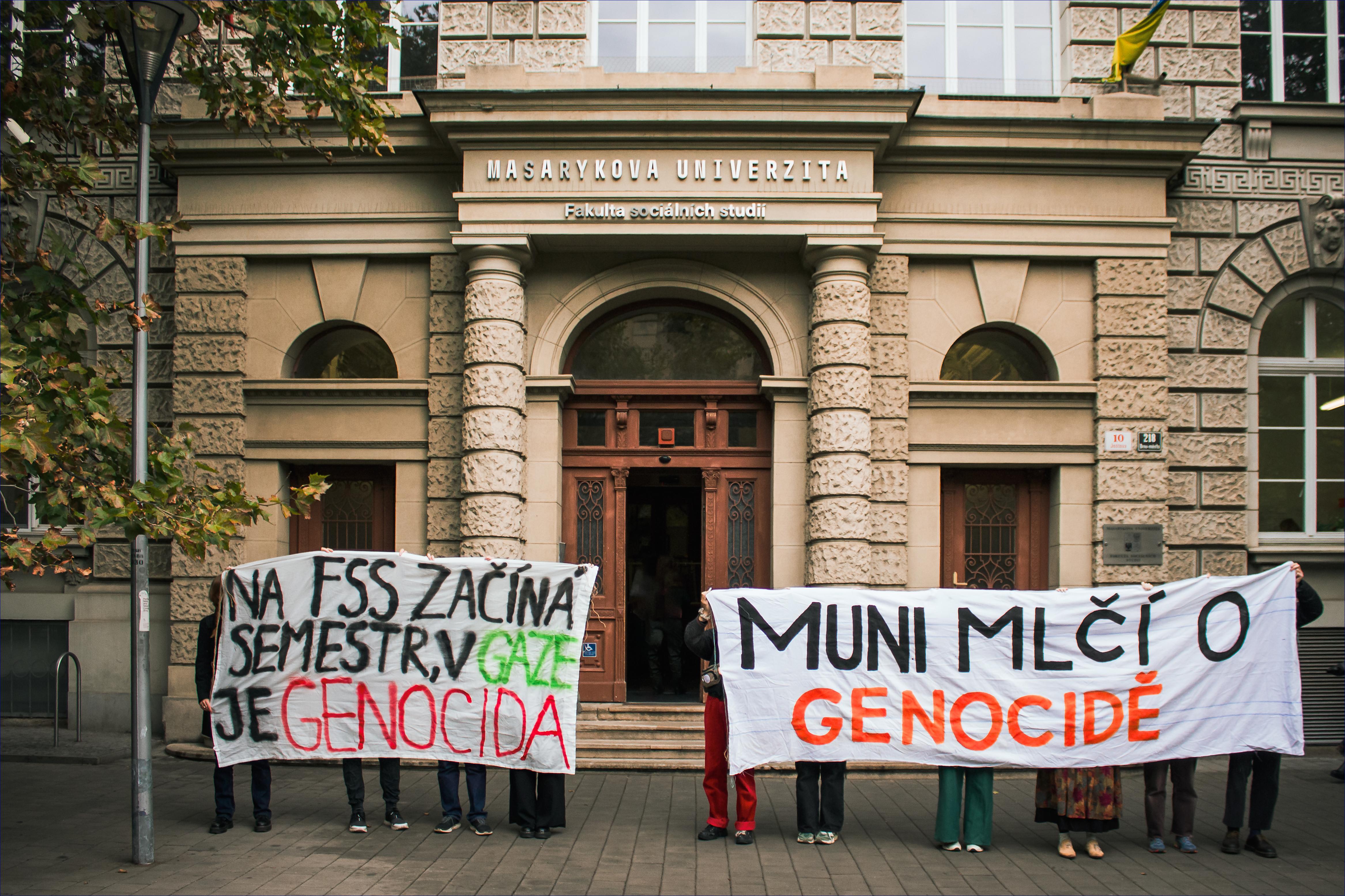 Dnešním dnem již téměř na všech univerzitách v České republice začal nový akademický rok 2025/2026. Studující různých oborů a zaměření, mezi něž patříme i my, opět zasedají do tříd a přednáškových místností. Nikoliv však v Gaze. Proto se studující napříč celou republikou zmobilizovali a rozvěsili na svých fakultách a univerzitách bannery s hesly “VUT cut ties with Israel”, “Studenti FSV UK proti genocidě”, “Na MFF začíná semestr v Gaze ne”, “MUNI mlčí o genocidě”, “Na JU studuju, v Gaze nemohou.” Akce se zúčastnili studující z Prahy, Brna, Českých Budějovic, Olomouce, Plzně - a to z následujících fakult a univerzit: AVU, FAMU, JČU, VŠCHT, 1. LF UK, 3. LF UK, PEDF UK, PřF UK, MFF UK, FHS UK, FSV UK, ČVUT FEL, PED MUNI, PrF MUNI, PřF MUNI, MUNI LF, MUNI FSS, MUNI FF, MUNI ESF, MUNI FI, FA VUT, VUT FIT, UMPRUM, MENDELU, FF UPOL, JAMU, ZČU a střední škola SCIO v Brně. Zkoordinovali se na 28 fakultách, 14 univerzitách či vysokých školách a na jedné střední škole napříč celou Českou republikou.