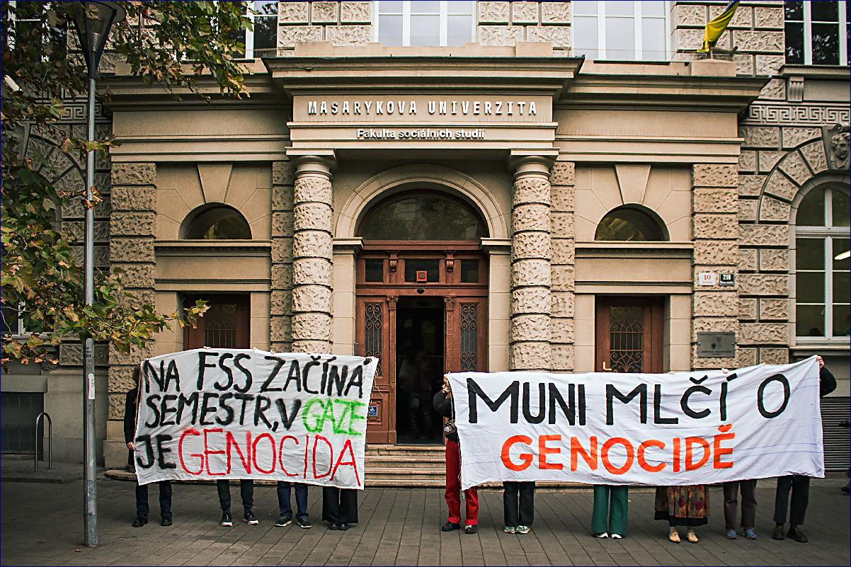 Lidskoprávní organizace i nezávislé vyšetřovací komise OSN potvrdily, že sionistický stát v Gaze páchá genocidu. Česká republika tuto genocidu stále diplomaticky, politicky a materiálně podporuje a spoluvinu na české pozici bezpochyby nese i naše akademická obec. Ta má moc ovlivňovat veřejné mínění, které je nadále většinově ovlivněno pro-izraelskou propagandou. Místo toho, aby poskytovala kritický hlas tak mlčí, nebo s genocidním státem přímo spolupracuje.