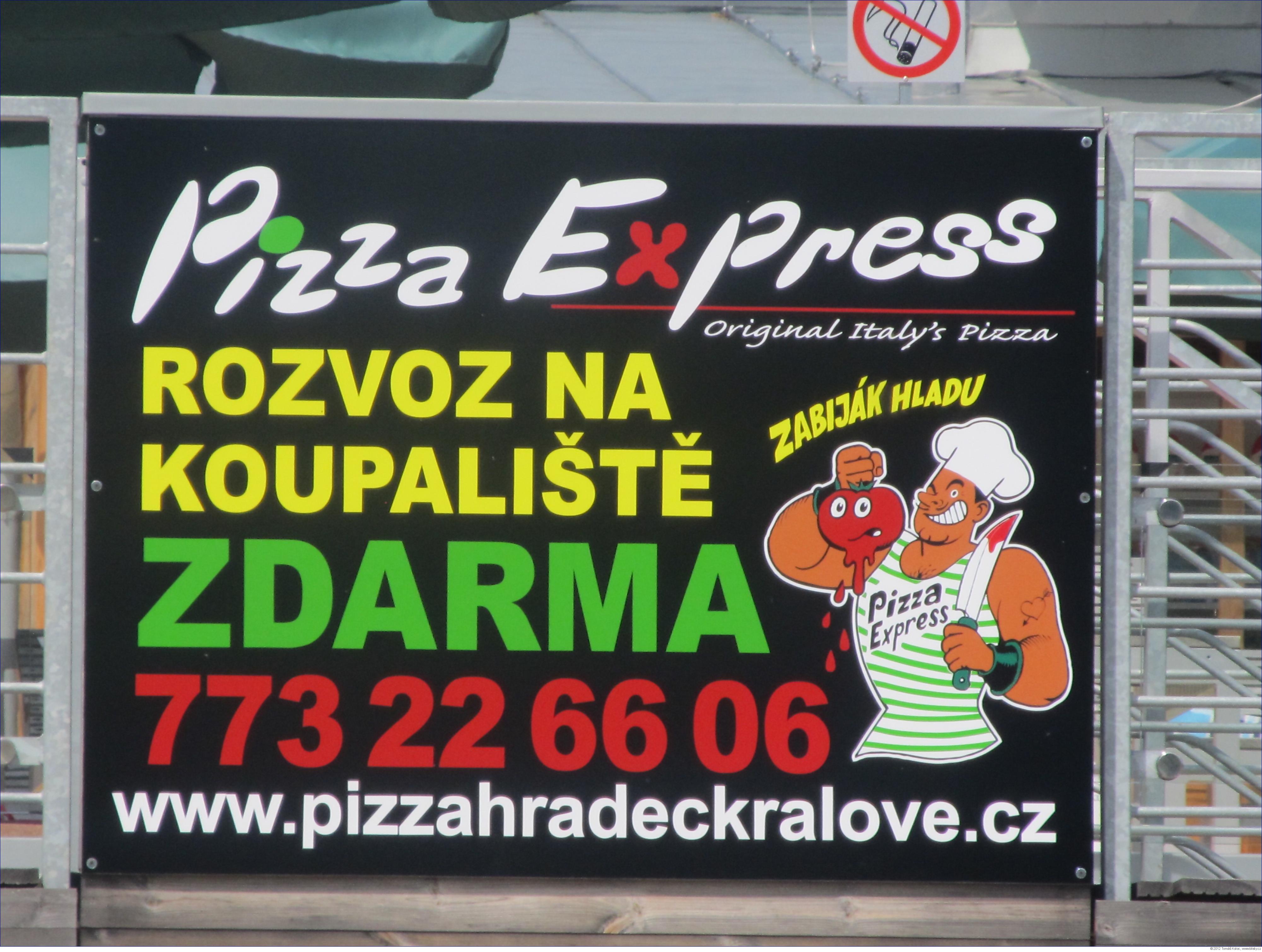 Včera jsem poprvé navštívil dva roky staré královéhradecké městské koupaliště se dvěma tobogány, mořskými vlnami, restauracemi... a mnoha reklamami. Jedna z nich hlásí, že nabízí "Rozvoz (pizzy) na koupaliště zdarma". Autor reklamního sloganu -- který si v mateřském jazyce není vědom rozdílu mezi službou, která spočívá v DOVOZU na určité místo, již je stále stejné (například koupaliště) a službou ROZVOZU po různých místech -- je zřejmě slabý i v jazyce cizím, neboť pochybuji, že chtěl souslovím "Italy's Pizza" vyjádřit to, co obrat doopravdy znamená, tedy "pizza patřící Itálii". (Sousloví mělo zřejmě správně znít "Italian Pizza".)