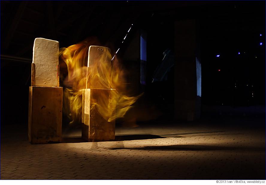 Vraťme se ale k výstavě. Spekulace o duševním rozpoložení autorů vyvrací kurátor Jan Mladovský: "Je to reakce na prostor, ve kterém se výstava odehrává. A ten prostor je velice silný a impozantní, tudíž výrazně dominuje." A právě zde se skrývá ona naděje, kterou první návštěvnice přehlédla, ač stála v jejím středu. Autoři se s hravou lehkostí dokázali přizpůsobit netradičnímu prostředí a s nevelkými náklady si s potěšením zkusili instalaci v potemnělém prostoru hnědavého šerosvitu místo ve standardně nasvětlené bílé galerii. Když pak kurátoři sehnali silná halogenová světla, byl největší zájem o kouty, kde ještě zůstala trocha tmy. Výstavu tvoří četné videoprojekce, plastiky, obrazy, fotografie a hříčky s tvarem, světlem, zvukem i psaným slovem. Nebojte se nahlížet do stínů. Třeba tam najdete něco, co vás inspiruje, co se vám bude líbit. Anebo se vám to líbit nebude. Konceptuální umění nebývá určeno k dekorativním účelům, je třeba ho chápat jako moderní formu filosofie, zamyšlení, které se obejde bez tlusté knihy, často i beze slov.