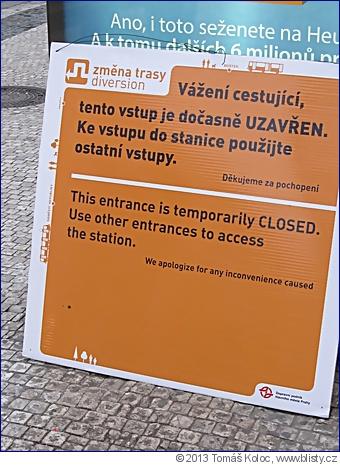 Minulý týden, když jsem se ocitl na pražském Masarykově nádraží a chystal se do metra, místo známého vstupu do stanice Náměstí republiky mě však zarazila plechová bariéra a opodál tato informační cedule, volně opřená o refýž blízké zastávky tramvaje (!) a zakrývající na ní umístěnou reklamu. Vyvedená hezky dvojjazyčně upozorňuje případného cestujícího, že vchod do metra je uzavřen. Její sdělení má jistě svou hodnotu, cestující se z ní dozví, že jiný vchod do stanice je přístupný, na rozdíl například od stanice Národní třída, která je uzavřena celá. Pátrání po tom, kde se zmíněné "ostatní vstupy" nacházejí, však už musí cestující podstoupit na vlastní pěst. Cedule (která -- jistě -- je nejspíš vyrobena v mnoha kusech pro různé stanice, nicméně by na ní mohlo být počítáno s plochou pro uvedení nějakého "lokálního dodatku") a priori počítá s Pražákem, který přece ví, že další vstup do metra je asi o čtvrt kilometru dál; rovně a vlevo. Jste-li "přespolní", užijte si ZDE dnes už zlidovělou píseň Pražského výběru z pera textařského klasika F. R. Čecha...