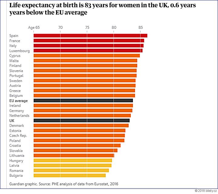 Deník The Guardian přinesl závěry výroční zprávy Public Health England. Zpráva, jež se opírá o statistiky Eurostatu, ukazuje, že ženy ve Velké Británii jsou z hlediska délky dožití až 17. v Evropě. Česká republika je ovšem z hlediska tohoto parametru ještě tři příčky za Velkou Británií a za ní už jsou pouze postkomunistické země. Přitom ženy ve Slovinsku mají výrazně vyšší průměrný věk dožití a patří v tomto ohledu k nadprůměru. Před ČR je ještě Estonsko. Ve srovnání s evropským průměrem není zaostávání ČR výrazné, nicméně oproti středomořským zemím (Španělsko, Itálie, Francie) a Lucembursku je to o několik let života méně.
